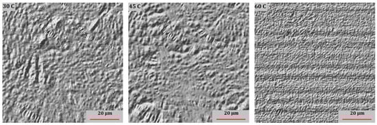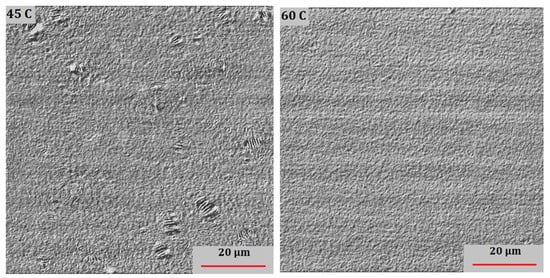 In Figure 7 and Figure 8, selected temperatures of the cooling, respectively heating scan for bitumen A (rate 1.25 °C/min) are represented. It can be seen in Figure 7 that progressively the bee structures are formed during cooling. The bee structures appear at temperatures below 50 °C and they can be clearly seen at 45 °C. Similarly, as shown in Figure 8, the bee structures disappear at temperatures greater than 60 °C during heating, in line with the end melting temperature of DSC. Apart from the bee structure formation upon cooling, it was noticed that the surface becomes coarser upon further cooling, whereas any potential vertical-like artefacts are due to small sample movements.