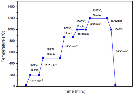 According to the powder supplier, the brazing temperature range should be set between 117 and 1260 °C. The coating deposition by vacuum brazing was accordingly performed at a maximum temperature of 1200 °C. The heating process was gradually performed with holding ramps (Figure 1) in order to provide enough time for the organic binder to decompose and for the powder alloy to melt and partially fill the gaps remaining from the decomposition of the organic binder.