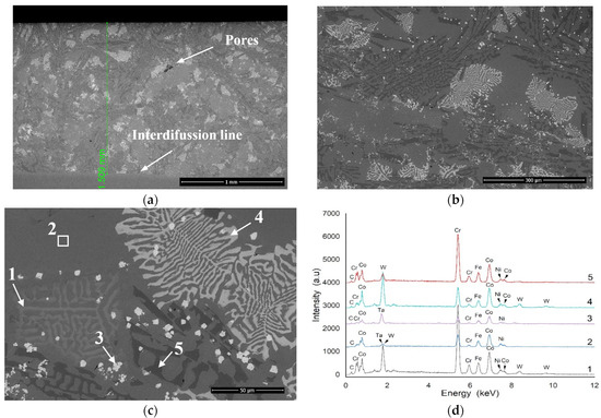 Figure 2 shows the microstructure of the vacuum-brazed coating at different magnifications. The cross-section micrographs display a homogenous phase distribution and a small quantity of pores. No microcracks were identified. Despite the fact that the tapes were rolled to a thickness of 2 mm after the brazing process, the deposited material was densified, and the coating thickness was reduced to values ranging between 1.3 mm and 1.5 mm. Good adherence of the coating to the substrate is revealed by the interdiffusion line. The microstructure displayed in Figure 2a–c consists of a discontinuous and randomly oriented dendritic hypoeutectic microstructure, with primary dendrites of Co-based solid solution surrounded by interdendritic lamellar eutectic with Cr-, Co-, W- carbides, or even Laves phases. These regions appear in different greyscales, depending on the local chemical composition (Cr-rich or W-rich regions) [27,28,29,30].