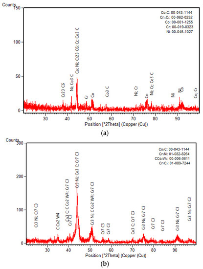 Nickel-based alloys are preferred in many high-temperature applications due to the attractive price of nickel. Co-based alloys are versatile and well-suited materials for coatings with excellent surface properties under high-temperature conditions [7,8]. They have good mechanical properties (especially strength at high temperature) and superior wear resistance compared to nickel-based alloys [9,10]. The alloys are described as wear, corrosion, and heat-resistant materials [11,12]. Welding and laser cladding are well-known conventional technologies used for surface refurbishment of damaged components [13]. Other technologies like thermal spraying (flame and plasma spraying, high velocity oxygen fuel spraying, cold gas spray, etc.) [14,15] and laser cladding [16,17] are used to deposit these alloys on engineering components in order to prolong their lifespan [11]. Both nickel- and cobalt-based alloys are processed nowadays using the aforementioned techniques, which contribute to partial remelting and mixing of the base material with the deposited coating. Thereby, new phases with a brittle aspect could be generated along the interface coating/substrate.