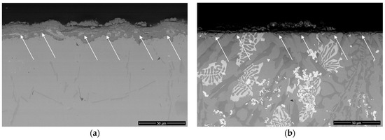 The degree of corrosion attack of the brazed coating was investigated in comparison with that of the substrate material after 100 h of exposure to the hot salt mixture at 750 °C. A preferential localized material degradation based on acidic fluxing of the formed oxides occurred (marked with arrows—Figure 4a,b). The substrate material developed a thicker oxide scale on the surface, mainly consisting of Cr and Fe oxides (Figure 5a,b). The corrosion products contain S and Cl, besides the elements corresponding to the chemical composition of the stainless-steel.