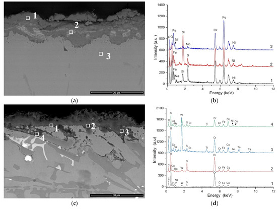 According to Figure 5c, the corrosion attack of the brazed coating is mainly concentrated in the regions of the eutectic from point 1, Figure 2c (with lower Cr-content), but also partially in the Co-based solid solution. The EDX chemical analysis (Figure 5b,d) indicates that the corrosion products formed on the sample surface consist mainly of Cr, O, and S, besides Fe and Ni. In addition to these elements, the oxidation products (in the case of the brazed coating) also comprise some easily diffused elements such as Co and Ta, which do not affect the surface state of the sample significantly [40]. The tendency of local corrosion attack, especially in the region of grain boundaries, and a certain degree of spallation of the resulted hot corrosion products, mainly by stainless-steel substrate, are identified [41]. Literature reported that, due to the high thermal load in such experiments and the initial susceptibility of this area to hot corrosion, a phase segregation can occur [42,43]. The processing temperature for the coating manufacturing is crucial in order to ensure a good phase distribution and, most importantly, diffusion, so no segregation of the W-, Ta-, or Cr-rich phases occurs. The cooling process of the coating should be carefully performed, as internal stresses can also easily inflict damage to heterogeneous materials.