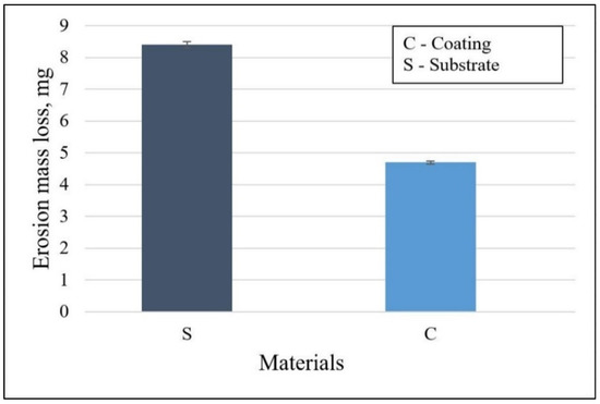 The solid particles erosion test was performed three times for the coating and for the base material, respectively [44]. The variation of the erosion rate at an impact angle of 90° is shown in Figure 6. The damaged region of the sample surface generated during exposure to erosion was a circle of approximately 12 mm diameter. The stainless-steel substrate exhibited a lower erosion resistance compared to the one with the brazed coating under similar test conditions. After 20 min of testing, the mass loss for the coatings was about 4.8 ± 0.05 mg, compared with 8.4 ± 0.1 mg for the substrate.