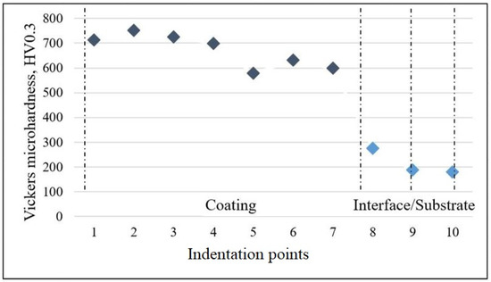 The microhardness HV0.3 (load force 300 gf, dwell time 5 s) of the coatings was measured using a Zwick/Roell YHVµ-S, Ulm, Germany tester equipment.