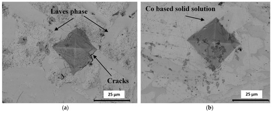 The Vickers microhardness values recorded on the cross section of samples are summarized in Figure 7. The microhardness values measured in the coating are higher than the ones recorded in the substrate, which corroborates a greater erosion resistance of the coating. The microhardness values of the coatings varied between 577 and 725 HV0.3, depending on the region where the microindentation was performed and on the material susceptibility to crack formation. Figure 8 illustrates the size of indentation path in a region with a higher number of hard phases, which is smaller than the one performed in the Co solid solution. It is known that carbides, silicides, or Laves phases are harder than Co-based solid solution [45]. Moreover, the absence of Palmqvist cracks that might have been formed from the corners of the Vickers indentation is an indicator of good fracture toughness. The crack propagations that could have appeared on the side of the indentation were effectively avoided due to the presence of the Cr3Ni ductile intermetallic phase.