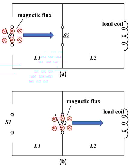 Flux pump devices were firstly proposed based on LTSCs, by using a straightforward circuit theory. As described by Van de Klundert [53,54], the pumping procedure is illustrated in Figure 1. Travelling magnetic flux enters the L1 loop with switch S1 open and approaches closed switch S2; afterwards the switch S1 is closed while S2 is opened to let the flux transfer into the L2 loop. The flux is then contained within the L2 loop, and hence the load coil is magnetized. The whole process can be periodically repeated to accumulate flux and ramp magnetization for the load coil. Owing to this cumulative effect, a small magnetic field can result in a very high charging current in the load coil. Mulder et al. reported a thermally switched flux pump in 1991, capable of generating a current of 100 kA [55]. On the foundation of this principle, various flux pumps have been proposed, and details can be found in a dedicated review for early-stage flux pumps [53].