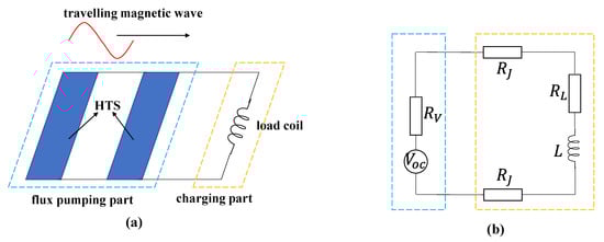 Inspired by the experimental tests in [47], it has been widely demonstrated that HTS flux pumps can be achieved by employing travelling magnetic waves. The generalized schematic diagram for a travelling wave HTS flux pump is illustrated in Figure 3a, which can be modeled by the equivalent circuit in Figure 3b. When an alternating magnetic field travels across the surface of HTSCs (typically HTS tapes), eddy currents will be induced and circulated within the superconductor. The current then results in an electric field, whose time-averaged integration over one cycle is derived to be a non-zero value. If the HTS tapes are connected to a load (usually HTS coils) to from a closed loop, then the flux pump can be considered as a DC voltage source , with internal resistance of , charging an inductive load that has an inductance of and resistance of through resistive joints . The whole system can be described by a Kirchhoff voltage equation: