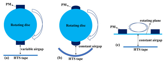 In contrast to the monotonic relationships described above, the generated voltage varies parabolically with HTS tape width in [69], namely the voltage initially increases up to a certain point and then starts to decrease as the tape width increases, which means there exists an optimal value for the tape width in order to achieve the highest voltage. However, it was found in [70] that the voltage will saturate at a certain point, after which further increase in the tape width has little impact on the voltage. The different relationships are attributed to whether or not a constant flux gap is maintained when the magnet passes over the HTS tape. The HTS dynamo modeled in [69] adopts the radial flux geometry, where the HTS tape and PM surface are flat so that the distance (along the magnetization direction) between the magnet and the tape varies as the magnet rotates, as shown in Figure 5a. As a comparison, the model in [70] still adopts the radial flux geometry but the surface of magnet and HTS tape are curved, which will result in a constant air gap (along the magnetization direction) between the magnet and HTS tape, as shown in Figure 5b. The underlying physics causing this peculiar bilateral tape width effect have not been reported yet, which requires further investigation. Regarding the configuration of HTS dynamos, it should be noted that a constant flux gap can also be achieved by adopting the axial flux geometry, in which the magnet is rotating in a plane parallel to the HTS tape surface, as shown in Figure 5c.