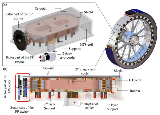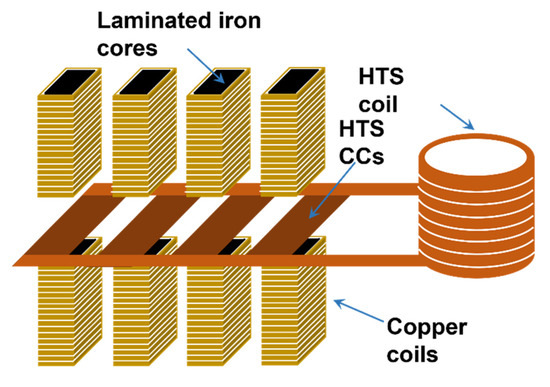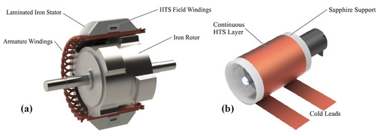The maturation of superconducting technology has led to a wide range of industrial applications and commercial products. Magnetic resonance imagining (MRI) and nuclear magnetic resonance (NMR) machines are vital equipment in modern medical diagnosis, which usually employ superconducting magnets to provide the required magnetic fields for physical examination of states of matter [1,2]. In the domain of motors/generators [3,4,5,6,7,8,9,10], superconductors have been attracting more and more attention since they are believed to be the optimal choice for electrification of large-size transport, such as electric aircraft, which requires the power density to be as high as possible. In the conceptual design of a hybrid-electric short-range aircraft A320 proposed by Rolls Royce and Siemens [11], a 10 MW, 7000 rpm superconducting generator employs high temperature superconducting (HTS) coils as the field winding and Litz wires for a two-layer distributed armature winding, which is capable of achieving a power density greater than 20 kW/kg. Another exemplary superconducting hybrid-aircraft project, funded by the German government, adapts the radial-flux-type fully superconducting electric motors and generators [12]. In this project, the rotor winding is composed of DC racetrack HTS coils and the stator winding consists of MgB2 wires, both of which are cooled to 20–25 K by liquid hydrogen. It was estimated that these fully superconducting machines designs can achieve a power density no less than 38.1 kW/kg.