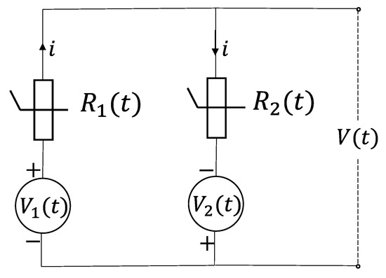 where and represent the electromotive force induced in each HTS tape, while and represent their resistance accordingly. is the cycle period of the applied field and is the total flux applied to the HTS loop. To fulfill the Faraday’s law, is zero. If the resistance in each HTS tape is constant throughout the operation, i.e., equals a fixed value, the effective voltage must be zero. However, if the resistances are time varying functions, it is possible that Equation (5) can lead to a finite non-zero result, which shapes the effective DC voltage. Geng et al. then discussed the field strength, the influence of rate of field change on the resistance, and hence attributed the DC voltage to the variation in the resistivity of type II superconductors.