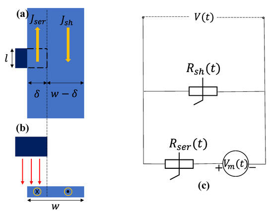 Almost at the same time, in 2016, Bumby et al. [77] published an enlightening work to explain the DC voltage origin for an HTS dynamo. In their work, the Giaver model was applied, which considers that the superconducting eddy currents “short-circuit” the high field region, e.g., the region beneath the PM during the passage of PM across the HTS tape as shown in Figure 8a,b. Under this assumption, the circulating current is expected to spread over the tape, such that: