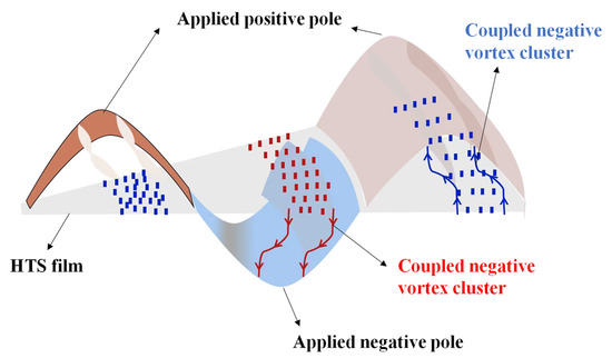As an alternative to the microscopic approach presented above, Wang et al. proposed a macroscopic theory [80] to explain the DC voltage generation in an HTS travelling wave flux pump. According to their explanation, the local-field inhomogeneity, i.e., a DC biased AC waveform, causes a coupling effect between clusters of coupled vortices and the applied magnetic poles, and the coupling force drags the vortex cluster into the HTS film and hence traps flux within it, as illustrated in Figure 9. The physics conceived in [80] tends to oppugn the non-linear resistivity established in [78,79], as they stated in [81]. The focus of the debate is that a pure AC waveform cannot prompt a DC output from a travelling wave flux pump, which was not clearly studied in [78,79]. However, the zero DC output voltage in a travelling wave HTS flux pump under pure AC fields should not be taken as evidence that challenges the theory based on the non-linear resistivity.