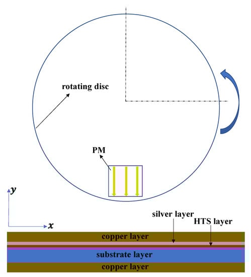Illustration of the modeling framework for an HTS dynamo (cross section view), and the golden arrows identify the polarization of PM, the blue twisted arrow means the rotating direction of the disc.