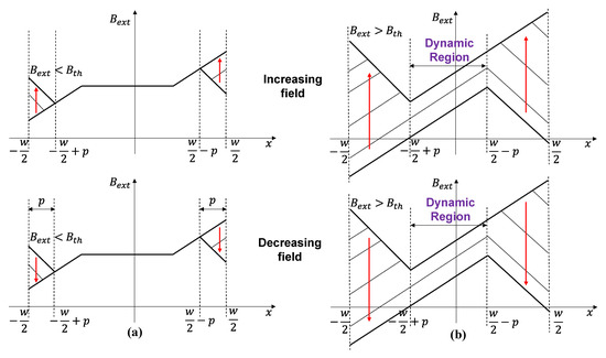 Magnetic profile inside an HTS conductor when it carries a DC current under an AC magnetic field. (a) The applied field is smaller than the threshold , (b) the applied field exceeds the threshold and creates the dynamic region. Adapted from [121].