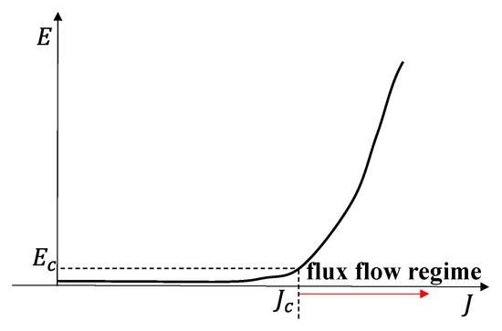Visualization of the E-J relation, the red arrow means that the flux flow regime appears after transport current exceeds the critical current density.