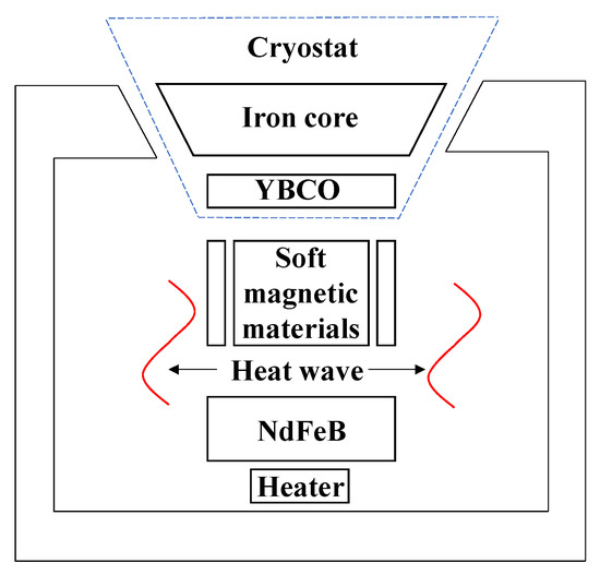 As mentioned earlier, Coombs et al. constructed a rig to magnetize YBCO samples [47,48,49]. In their experiments, they conjoined soft magnetic materials with hard ones in the flux path, as shown in Figure 15. The soft magnetic materials (e.g., Prussian Blue puck) undergo a change in permeability and the hard ones (e.g., permanent magnet NdFeB) undergo changes in magnetization when their temperature changes. As a combinational effect, magnetic pulses can be generated to travel over the surface of the superconductors. Technically, the operation principles are similar to the later conceived travelling wave HTS flux pumps. This type of thermal actuated HTS flux pumps have not been further developed, due to the challenges faced in operation. However, it is of great significance since it firstly realized flux pumping for HTSCs without any break of superconductivity.
