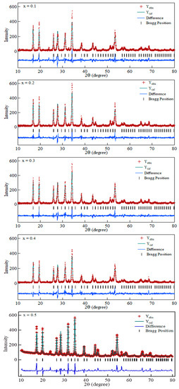 The XRD patterns of LLT-Ga samples are shown in Figure 1. The observed patterns in Figure 1 agree with the standard XRD database of Li5La3Ta2O12 (PDF#45-0109), indicating the formation of the cubic garnet structure. Minor impurity peaks are also observed in the XRD patterns of these materials. The Rietveld refinement method was deployed using RIETAN-2000 software [28] for the investigated materials in order to elucidate the lattice parameters of the materials.