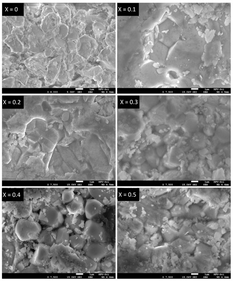 The results in Figure 1 indicate that LLT-Ga samples have cubic structure with the space group with an average lattice constant of 12.827 Å for x = 0.1–0.5 samples. The value of the lattice constant of the current LLT-Ga garnets agrees well with the value of 12.85 Å reported previously for LLT samples prepared by the sol-gel technique [14]. Moreover, we noticed that there was no change in the lattice constant with increasing Ga+3 content due to the close matching between the ionic radius of Ga+3 (0.62 Å) with that of Ta+5 ions (0.64 Å). In Figure 1 we notice the presence of impurity peaks in the XRD patterns. One major impurity peak was observed in x = 0.1 sample at 23.8°, whereas the impurity content increased for x = 0.5 sample, as evidenced by the presence of several impurity peaks at 23.5°, 29.9°, 41.2°, 42.5° and 56.2°. The impurity phases could be assigned to LiGaO2 (PDF# 72-1640) and La2O3 (PDF# 74-1144). SEM micrographs for LLT-Ga ceramics are shown in Figure 2. Dense ceramics with well-defined coarse grains were obtained for all Ga+3 compositions, with grain size in the 3–5 μm range. It can be observed in Figure 2 that no noticeable changes in the grain size or the morphology of the ceramics were observed with increasing Ga+3 substitutions in the materials.