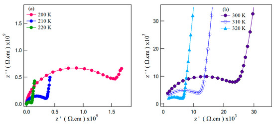 Complex impedance diagrams at selected temperatures for Li5.6La3Ta1.7Ga0.3O12 garnets at (a) low and (b) high temperature regions.