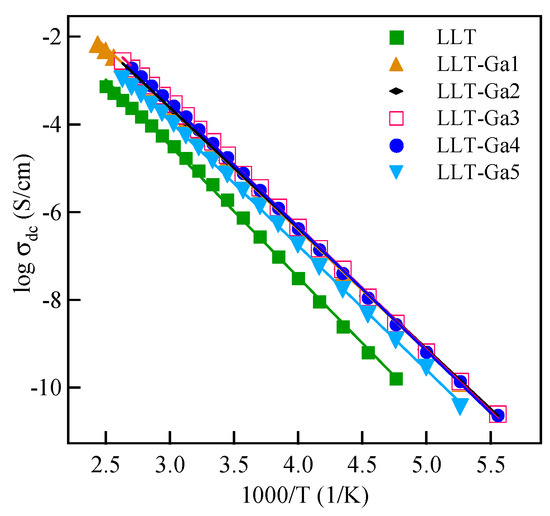 Impedance diagrams of LLT-Ga3 ceramics are shown in Figure 3 as a representative example. A single semicircle at the high frequency region is observed, where the effect of the grain boundaries could not be distinguished in this figure. Therefore, the real axis intercept of the semicircles represents the total resistance, R, of the materials. The total ionic conductivity was calculated by the relation; , where l is the sample thickness and A is the surface area. The variation of the lithium ionic conductivity of LLT-Ga ceramics with temperature is depicted in Figure 4, where the conductivity follows the Arrhenius relation;
