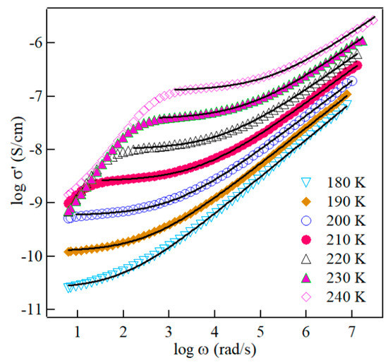 The conductivity spectra of LLT-Ga garnets with x = 0.30 at different temperatures. The solid curves between the points represent the best fits to Equation (2).