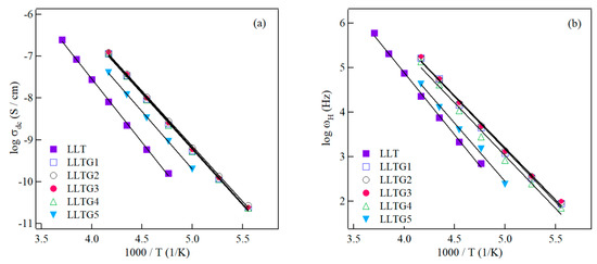 According to the chemical formula Li5+2xLa3Ta2-xGaxO12 of Ga+3 substituted garnets the Li+ content per unit formula was expected to increase from 5Li in pure LLT to (5 + 2x)Li for x content of Ga+3. The increased content of Li+ ions could be the reason for the enhanced conductivity of Ga substituted LLT materials. Furthermore, Ga+3 substitutions in LLT-Ga materials may create accessible vacant sites for Li+ ions, which enhance mobility and conductivity. In the following, we will estimate the hopping frequency (ωH) and the concentration (nc) of mobile Li+ ions in LLT-Ga garnets. The conductivity spectra of LLT-Ga3 ceramics are shown in Figure 5. A frequency independent dc conductivity was observed at low temperatures and frequencies, followed by a dispersion region where increased with frequency at the high frequency range. The conductivity data were analyzed by the following formula [29,30,31,32],