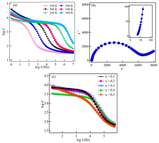 (a) ε′ spectra for LLT-Ga1 at selected temperatures as a representative sample and (b) the Cole-Cole diagram at 280 K for LLT-Ga1 with the inset showing high magnification of the high frequency region. (c) ε′ spectra for all Li5+2xLa3Ta2-xGaxO12 compositions at 300 K.