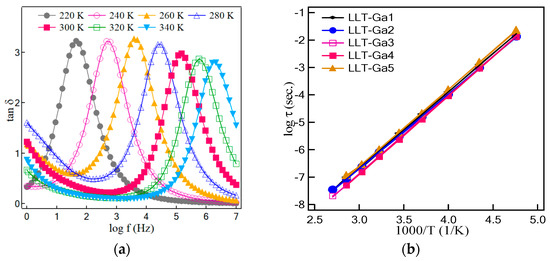 (a) The frequency dependence of tan δ for LLT-Ga1 as a representative example, and (b) the temperature dependence of the dielectric relaxation time of Li5+2xLa3Ta2-xGaxO12 garnets.