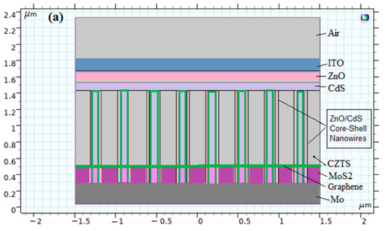 The particularity of this model is that a graphene layer is not only sandwiched between the CZTS and MoS2 layers but also placed between the ZnO core and its CdS shell. Additionally, these ZnO/CdScore-shell nanowire arrays are embedded in the CZTS absorber and MoS2 layer; the assembly is located between a Mo layer below and the CdS/ZnO/ITO structure above.