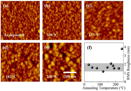 The as-deposited SnTe films are polycrystalline, composed of small grains with an average size of 30 nm. Films annealed at °C exhibit no difference in morphology in comparison with the as-deposited films. However, for films that were annealed at , the average grain size increases notably with annealing temperature, indicating the occurrence of recrystallization. The representative AFM images of the SnTe films are presented in Figure 1a–e and Figure S3 in the Supplementary Materials.