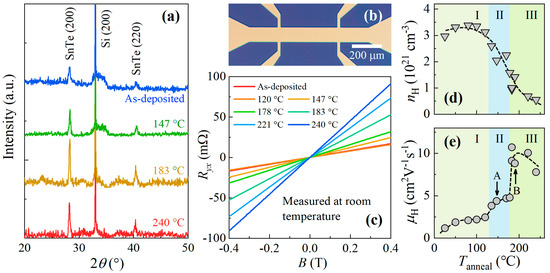 (a) X-ray diffraction patterns of 50-nm-thick SnTe films annealed at various temperatures. (b) Optical image of a typical Hall-bar device fabricated of sputtered SnTe film. The Hall-bar is 100 μm in width, with a length-to-width ratio of 4:1. All transport data in this work were measured in Hall-bar devices with the same design. (c) Room-temperature Hall resistance of SnTe films. For clarity, only a few representative curves are shown. (d,e) Room-temperature Hall carrier density () and Hall mobility ( ) plotted as a function of annealing temperature. The dashed lines are a guide to the eye. The figures are divided into three regions according to the shape of the curve. The arrows in (e) indicate the samples based on which devices A and B were fabricated.