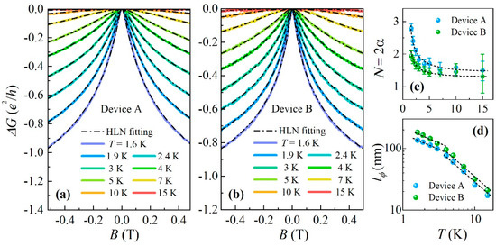 As shown in Figure 4c, at , the extracted values of are and for device A and B, respectively. As decreases, the curves show a sharp upturn at , below which increases rapidly and finally reaches and at . These observations are consistent with previous research on WAL in SnTe films [11,12,13].