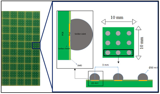 A full array (12 × 12) of SAC305 with an FR-4 substrate was used as a test vehicle in this study. Solder Mask Define with OSP surface finish was utilized. Two stencils with different diameters were employed for test vehicle fabrication. The tacky flux was printed using the small stencil, and the large stencil was employed to apply the solder ball. Figure 1 shows the studied test vehicle. To install the substrate into the testing machine, the full substrate was cut into a small array of solder joints (3 × 3). The pitch distance measured between the solder joints was 3 mm. The diameters of the solder joint and the copper pad were 10 and 22 mil, respectively.