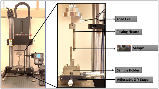 An accelerated fatigue shear test was applied in the individual solder joint under stress control conditions using the Instron 5948 (Instron, Norwood, MA, US) micro testing machine. A special fixture was designed and fabricated to serve as an adapter between the test vehicle and the testing machine. A small chamber that was designed for this type of machine was employed to control the testing temperature. Figure 2 displays the Instron machine that was used in the fatigue shear test. The detailed configurations between the individual solder joint and the testing fixture are shown in Figure 3.