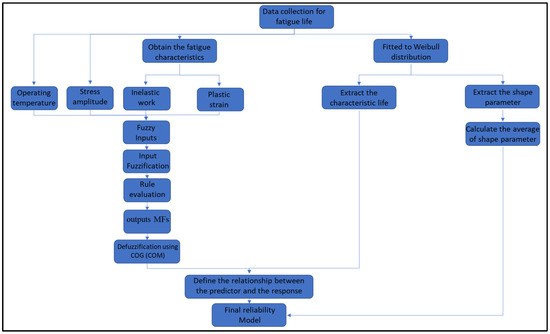 At steady state regions, average inelastic work per cycle and plastic strain were calculated for each replicate. Each stress amplitude, operating temperature, plastic strain, and inelastic work per cycle were used for predicting the characteristic life via fuzzy logic. The Mamdani fuzzy logic was implemented to combine all independent variables into a single predictor (COM-Value) by considering the original predictors as inputs to the fuzzy system. The inputs were classified into two classes based on their effects on the fatigue life. Two membership functions (MFs) were created for each input in the fuzzy system, and five MFs were developed for the output. A set of rules was established to identify the correlations between the fuzzy inputs and the fuzzy output. The center-of-gravity (COG) method was used as a defuzzification method. The characteristic life as a function of the COM-Value was predicted by a general empirical equation. To build a general reliability model as a function of time and the COM-Value, the prediction empirical equation was substituted into the Weibull equation (Equation (1)) in place of characteristic life (θ). The shape parameter was estimated by calculating the mathematical averages of the shape parameter values for all experimental combinations. The flow chart of the prediction model is presented in Figure 4.