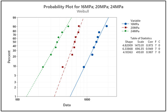 The fatigues life cycles at each replicate were obtained as a result of the fatigue shear tests. The stress-strain curve for each cycle of the fatigue life was plotted as well in order to obtain the fatigue properties. The reliability analysis was performed by fitting the fatigue data to a two-parameter Weibull distribution by using Minitab 19. Because complete failures were obtained for all tested samples, the least squared method was utilized as an estimation method for the distribution parameters (the shape and characteristic life). These parameters were then extracted from the two-parameter Weibull distribution for the accelerated shear fatigue tests at different shear loads and operating temperature levels using the fatigue life data. Figure 5 displays the Weibull probability plot for the fatigue life of SAC305 solder joints at a 25 °C operating temperature and different levels of stress amplitude. The slope of the Weibull probability line represents the shape parameter, and the intersection at 63.2% is the characteristic life or scale parameter of the Weibull distribution. An acceptable goodness of fit can be observed from Figure 5, where most of the life points were approximately located in the probability plot. The same observations were found at different operating temperatures. Table 2 shows the obtained characteristic life and shape parameter for all experiments. From Table 2, the characteristic life is reduced when the stress level or operating temperature is increased. To construct a general reliability model as a function of operating conditions, a general empirical equation was initiated. An unpredictable pattern of the shape parameter values was observed when the operating conditions fluctuated. Therefore, the mathematical average of the shape parameter for all combinations was determined, which was 6.07.