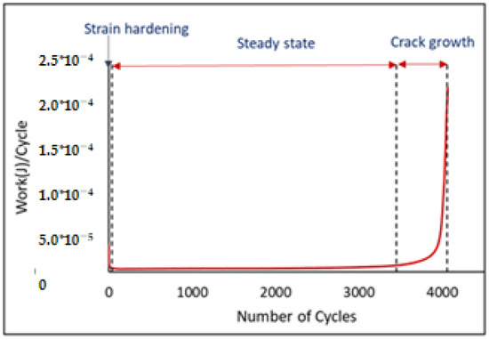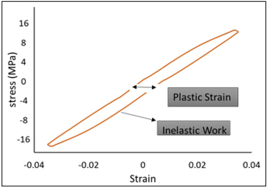 The characteristic life was influenced by different factors, such as operating temperature and stress level. In addition, the inelastic work and plastic strain values are other factors that can impact the characteristic life values according to the Coffin–Manson and Morrow energy models [31,32]. Therefore, a MATLAB code was used to obtain the average value of plastic strain and inelastic work per cycle. Figure 6 shows the stress-strain curve for one cycle of solder joint life under the accelerated shear fatigue test cycled at a 16 MPa stress level and 25 °C operating temperature. The area under the curve displays the inelastic work per cycle, and the shift in the strain at 0 stress amplitude is the plastic strain. The average work per cycle and plastic strain, which were considered as predictors for the characteristic life, were computed at the steady state region, as shown in Figure 7. Table 3 represents the average inelastic work per cycle and plastic strain at each experimental setup.