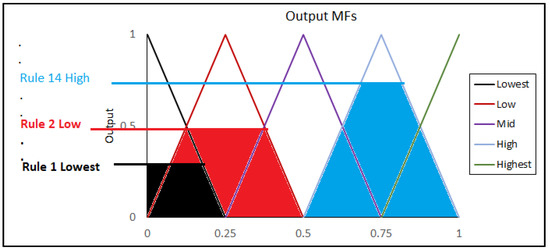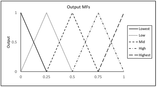 After initiating the rules, the output MFs were found based on the input relationships and their effect on the fatigue life. For this study, five output MFs (Lowest, Low, Mid, High, and Highest) were defined. Figure 10 displays the linear output MFs.