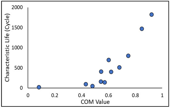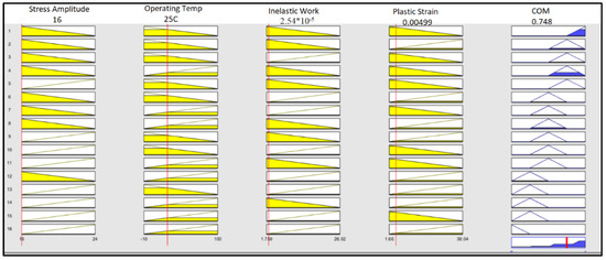 In this function, all fuzzy input values were transformed into a COM using the COG method. Figure 11 represents the methodology of the COG defuzzifier starting from the fuzzy input to a COM-Value. The COG concept is based on determining the center of the areas that are formed from the intersections between the result of the rules and the output MFs. Table 5 shows the COM-Value at each experimental combination with characteristic life values. Figure 12 exhibits the COM-Value at the 16 MPa stress level, 25 °C operating temperature, 0.00499 plastic strain, and 2.54 × 10−5 inelastic work as obtained using MATLAB 16 (MathWorks, Natick, MA, USA) software.