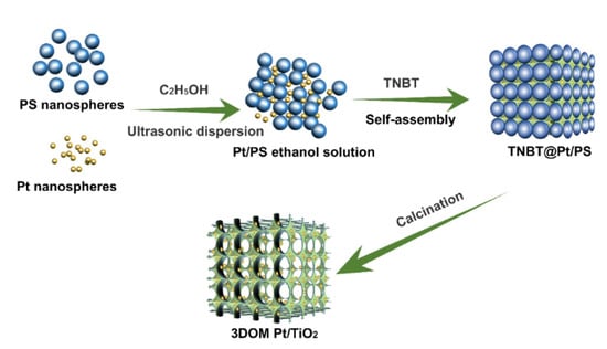 0.001 g of platinum nanoparticles and 0.2 g of PS template were added into 20 mL of absolute ethanol for ultrasonic dispersion for 0.5 h and then placed in an oven at 80 °C for drying to obtain the Pt/PS template. Tetrabutyl titanate (TNBT) was added gradually to the Pt/PS template to completely infiltrate the voids of Pt/PS template. After the obtained TNBT@Pt/PS mixture was naturally aged at room temperature for 24 h, it was calcined in a muffle furnace at 550 °C to remove the PS template, and finally, 3DOM Pt/TiO2 was obtained. 3DOM TiO2 was also prepared according to the same procedure of 3DOM Pt/TiO2, except for the addition of Pt.