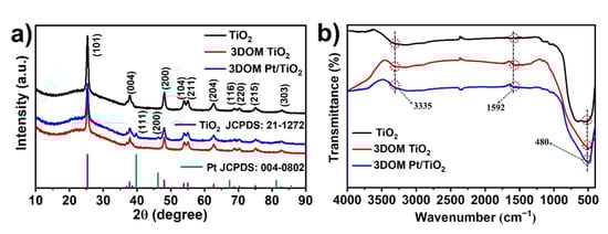 (a) XRD patterns, and (b) FT-IR spectra of TiO2, 3DOM TiO2 and 3DOM Pt/TiO2 samples.