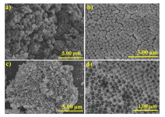 SEM images of (a) TiO2; (b) PS spheres; (c) 3DOM TiO2; and (d) Pt/TiO2.
