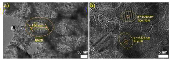 The microstructure of the 3DOM Pt/TiO2 sample was further examined by TEM and HRTEM. Figure 4a shows that 3DOM Pt/TiO2 has an ordered macropore structure, which is consistent with the SEM results. In addition, the HRTEM image obtained in the pore wall part of 3DOM Pt/TiO2 (Figure 4b) reveals clear lattice fringes, further verifying the high crystallinity of 3DOM Pt/TiO2. The d spacing values of 0.358 nm and 0.231 nm matched with the (101) crystal plane of TiO2 and (111) plane of Pt, respectively.