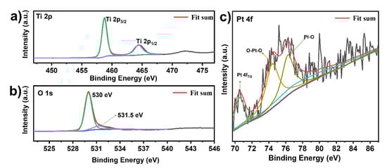To investigate the elemental composition and chemical valence states in the Pt-loaded 3DOM TiO2, an XPS test was carried out and the obtained XPS spectra are shown in Figure S3 and Figure 5. The full survey spectrum of XPS (Figure S3) verifies the existence of Ti, O and Pt elements in the 3DOM Pt/TiO2 product, which is consistent with the above EDX result (Figure S1). The peaks at 458.8 eV and 464.4 eV in the high-resolution Ti 2p XPS spectrum (Figure 5a) can be attributed to Ti 2p3/2 and Ti 2p1/2 species of TiO2, respectively, whereas the peak with binding energy of 530 eV in the O 1s spectrum (Figure 5b) originates from the lattice O in TiO2, and the peak at 531.5 eV stems from the hydroxyl (–OH) component adsorbed on the TiO2 surface [29]. In addition, the XPS spectrum of Pt 4f (Figure 5c) shows a peak at 70.7 eV from the metal Pt 4f7/2, indicating the successful loading of the Pt. The peaks at 74.4 eV and 76.3 eV correspond to the O–Pt–O and O–Pt bonds formed by the oxidation reaction of Pt under high-temperature conditions [33].