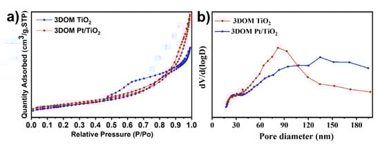 (a) N2 adsorption–desorption isotherms of 3DOM TiO2 and 3DOM Pt/TiO2 samples; (b) pore-size distribution curves of 3DOM TiO2 and 3DOM Pt/TiO2 samples.
