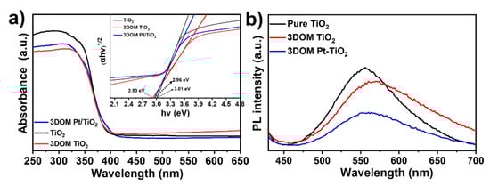 The UV-vis spectra of TiO2 and 3DOM Pt/TiO2 are shown in Figure 6a. The commercial TiO2 has an absorption edge at ~412 nm and energy gap (Eg) of 3.01 eV. Compared with TiO2, the absorption edge of 3DOM Pt/TiO2 has red-shifted to 419 nm and the energy gap (Eg) is reduced to 2.96 eV. The narrower band gap of the resultant 3DOM Pt/TiO2 is more favorable for visible light absorption, which might be attributed to the slow photons and multiple scattering effects generated by the ordered macroporous network structure of 3DOM Pt/TiO2, as well as to the property of the dielectric constant with periodic changes [17,38,39]. To investigate the recombination and migration behavior of photogenerated carriers in TiO2, 3DOM TiO2 and 3DOM Pt/TiO2, we performed photoluminescence (PL) tests at 375 nm excitation wavelength (Figure 7b). The results show that TiO2 exhibits a high photoluminescence intensity, indicating a high recombination of photogenerated electrons and holes, thus resulting in low photocatalytic performance. As for 3DOM TiO2, its PL intensity is lower than that of TiO2. Among these three photocatalysts, 3DOM Pt/TiO2 demonstrates the lowest PL intensity because the contact interface between Pt and TiO2 could have formed a Schottky barrier, which effectively reduced the recombination of photogenerated carriers [33,40].