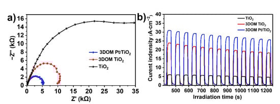 To further study the separation and transport efficiency of photogenerated carriers in TiO2, 3DOM TiO2 and 3DOM Pt/TiO2, electrochemical impedance spectroscopy (EIS) and transient photocurrent response measurements under visible light (λ ≥ 420 nm) irradiation conditions were tested. As shown in the Nyquist plots (Figure 8a), the semicircle diameter of TiO2 is significantly larger than those of 3DOM TiO2 and 3DOM Pt/TiO2, among which 3DOM Pt/TiO2 exhibits the smallest diameter, indicating that the introduction of Pt can effectively improve the conductivity of 3DOM TiO2. The remarkably increased conductivity of 3DOM Pt/TiO2 is beneficial to the transport and separation of photogenerated carriers during the photocatalytic reaction process. The transient photocurrent responses of TiO2, 3DOM TiO2 and 3DOM Pt/TiO2 under visible light irradiation (λ ≥ 420 nm) are shown in Figure 8b. Apparently, the as-prepared 3DOM Pt/TiO2 catalyst demonstrates the highest photocurrent density of about 30 A cm−2, whereas this value of commercial TiO2 is only ~6 A cm−2, further indicating that the 3D ordered microporous structure and the Pt loading effectively promote the transport and separation of photogenerated carriers.