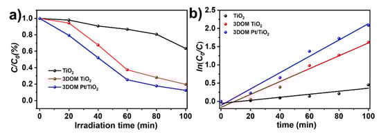RhB was used as a typical dye pollutant to evaluate the photocatalytic performance of TiO2, 3DOM TiO2 and 3DOM Pt/TiO2 under visible light irradiation. Figure 9a shows that the degradation ratios of RhB over TiO2, 3DOM TiO2 and 3DOM Pt/TiO2 are 37%, 80% and 88%, respectively, after 100 min of photodegradation experiments. The degradation rate of 3DOM Pt/TiO2 is significantly higher than that of TiO2, which indicates that the construction of three-dimensionally ordered macropores and the loading of Pt possess high photogenerated carrier separation, which can effectively improve the photocatalytic activity [41]. The superior photocatalytic performance of 3DOM Pt/TiO2 is attributed to the ordered arrangement of periodic macropores of TiO2, which provides rich adsorption sites for RhB. Meanwhile, the large specific surface area increases the light-soaking area, and the spatially interlaced pore structure causes slow photon and multiple scattering effects [42,43]. According to the Langmuir–Hinshelwood model, the photocatalytic degradation of RhB is consistent with the following equation: