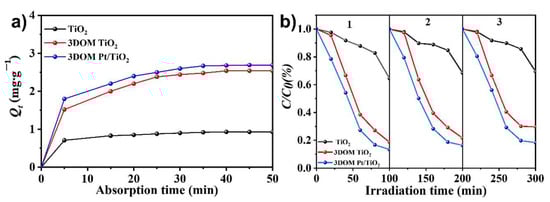 To evaluate the adsorption performance of the photocatalysts, we investigated the effect of TiO2, 3DOM TiO2 and 3DOM Pt/TiO2 on the adsorption of RhB. Figure 10a shows that during the adsorption process within 50 min, 3DOM TiO2 and 3DOM Pt/TiO2 samples can adsorb more RhB than TiO2, due to the greater number of adsorption sites on the 3DOM TiO2 and 3DOM Pt/TiO2 samples. The above results suggest that the 3DOM Pt/TiO2 sample is favorable for mass transfer and capture of dye molecules, thus exhibiting higher photocatalytic activity.