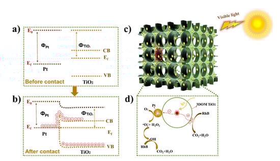 (a) Energy level of Pt before contact with TiO2. (b) Schematic diagram of electron transfer from TiO2 to Pt co-catalyst and formation of a Schottky barrier. (c,d) schematic diagram of the reaction mechanism of 3DOM Pt/TiO2 as a photocatalyst for the degradation of RhB under visible light (λ ≥ 420 nm) irradiation.